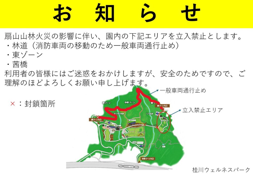 扇山林野火災に伴い、公園敷地内を一部閉鎖させていただくことになりました。夜間ついては、園内の主要出入口を全て閉鎖し、立ち入りを禁止させていただきます。お車でなく、徒歩でお越しであっても夜間は危険ですから園内には入らないようお願いいたします。