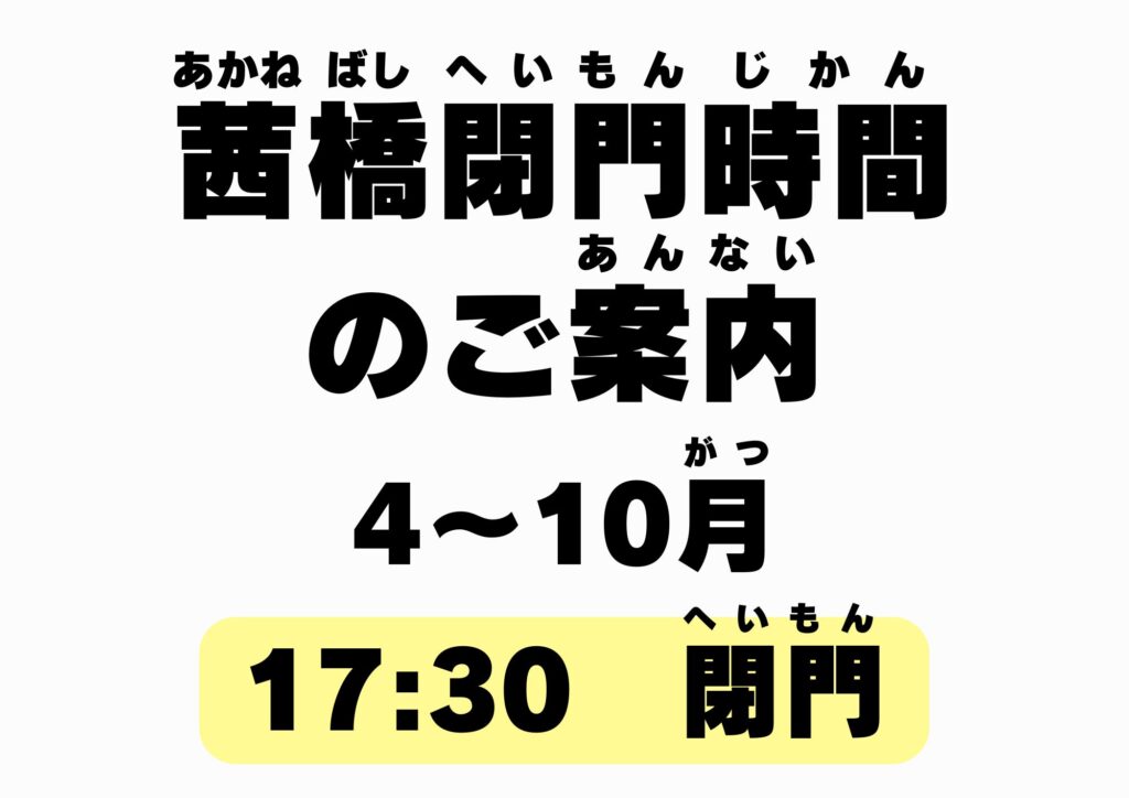 茜橋の施錠時間が4月より17:30分に変わります。