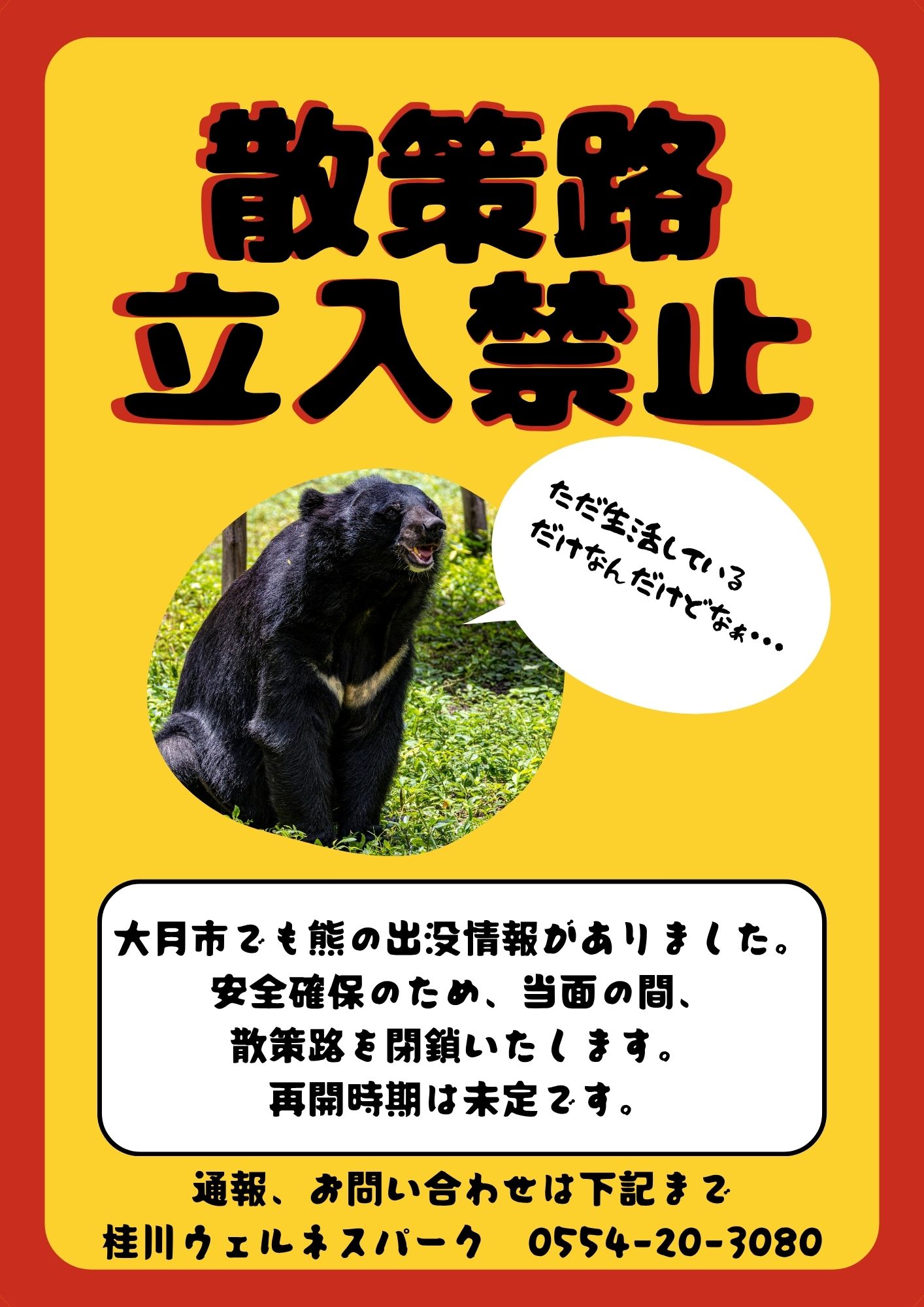 散策路を一時的に閉鎖させていただきます。 11月に入り全国各地でクマの目撃情報や被害が多くみられています。 桂川ウェルネスパークは山々に囲まれていて多くの生物が近くで生きています。 散策路は人目が付きにくく、森に囲まれています。 被害が起こってからだと遅いため、しばらくの間は閉鎖にさせていただきます。再開時期は未定です。 皆様にはご迷惑おかけしますがご理解とご協力よ